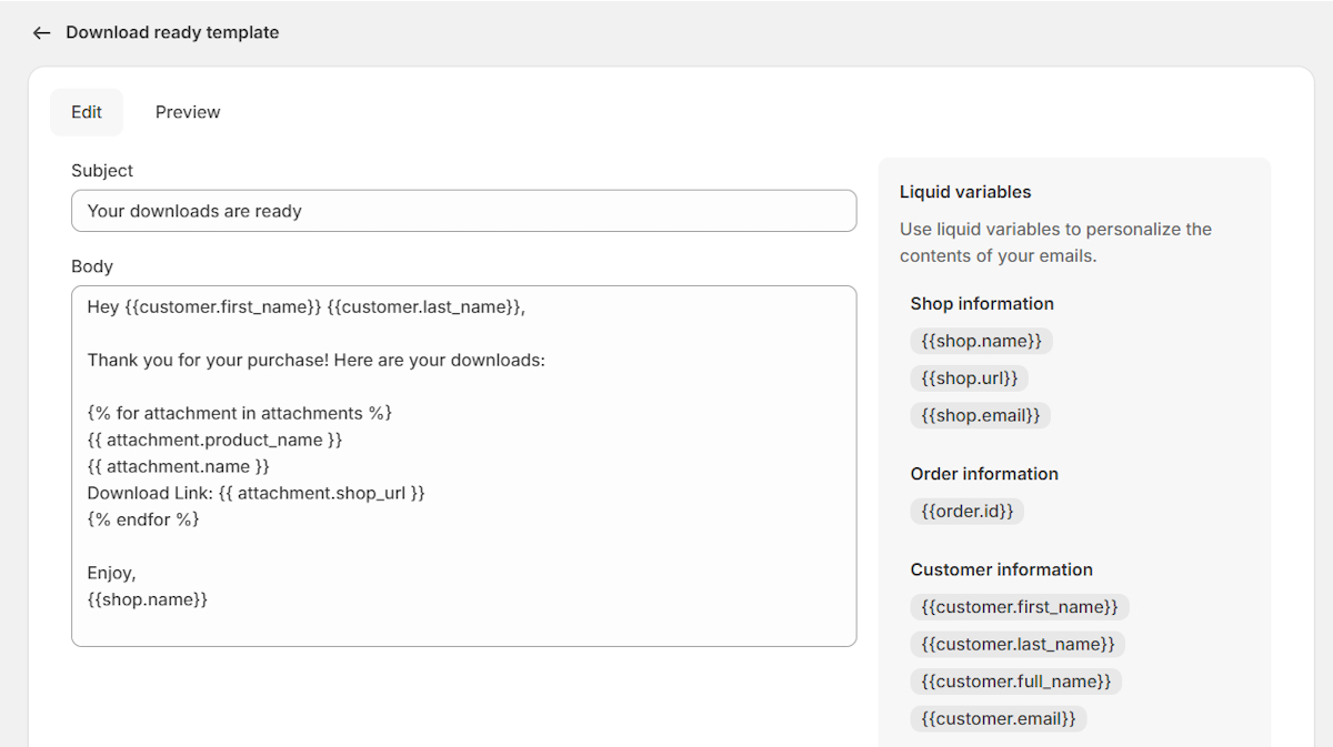 Digital product fulfillment usually happens through email delivery. Once customers buy an item, they expect immediate delivery. The Shopify Digital Downloads app lets you easily customize emails. Here’s how: